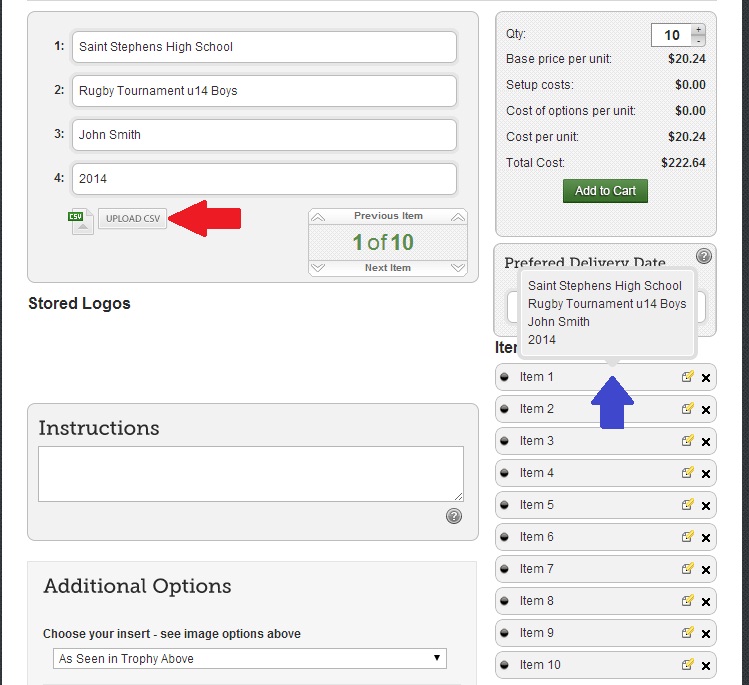 STEP 4 - Continue entering your list down column "A", "B", "C", "D" equal to the number of badges/trophies you wish to order i.e. in this example you can see we needed 10 items in total.
