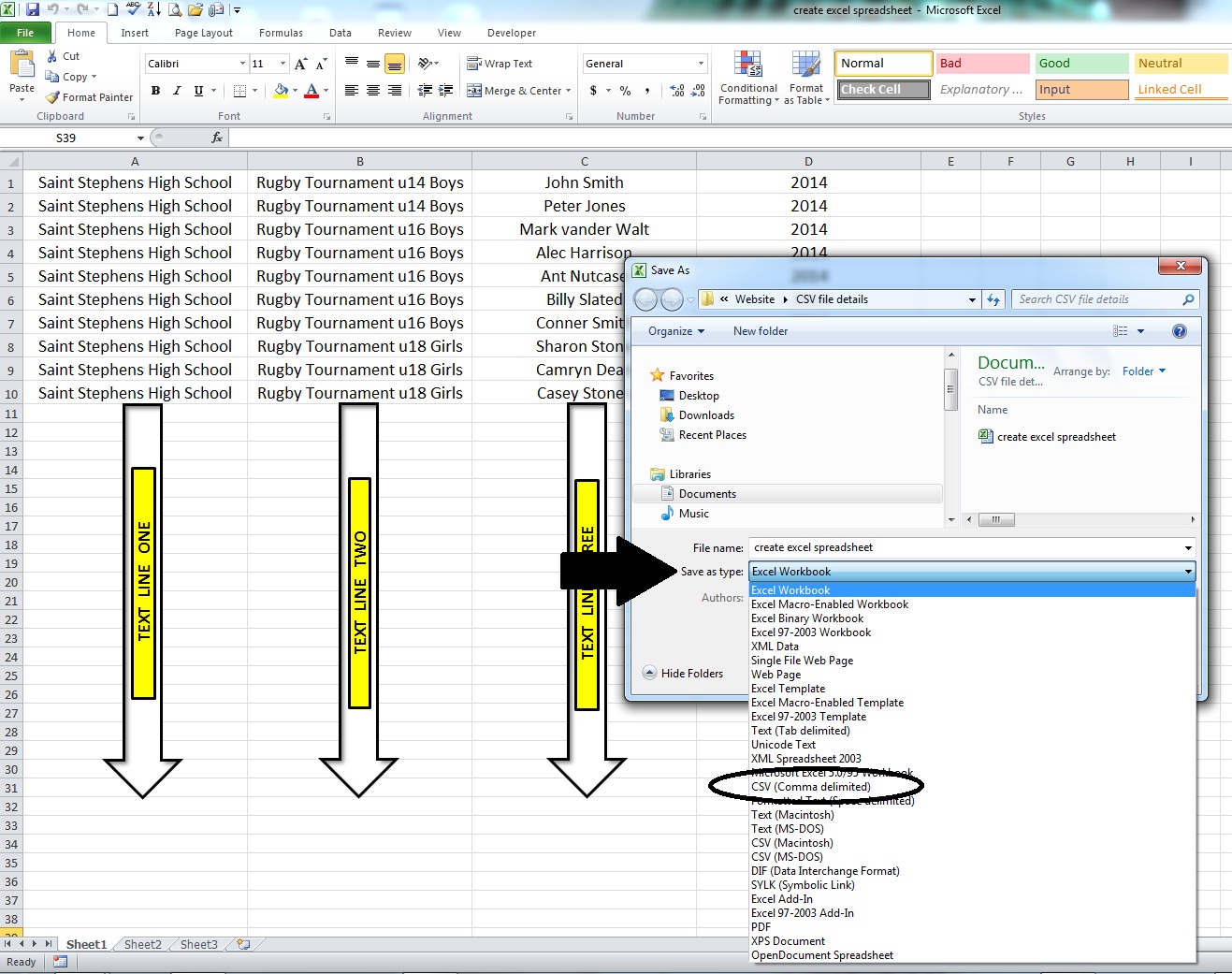 Click on the "Save as type" bar as seen in diagram below - (see black arrow). The screen expands, look down your list for the CSV (Comma Delimited) name, select this as the type. Then click save.